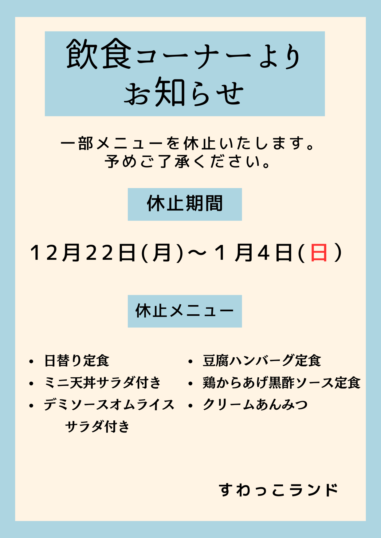 飲食コーナーよりお知らせ 一部メニュー休止(12/22~1/4)