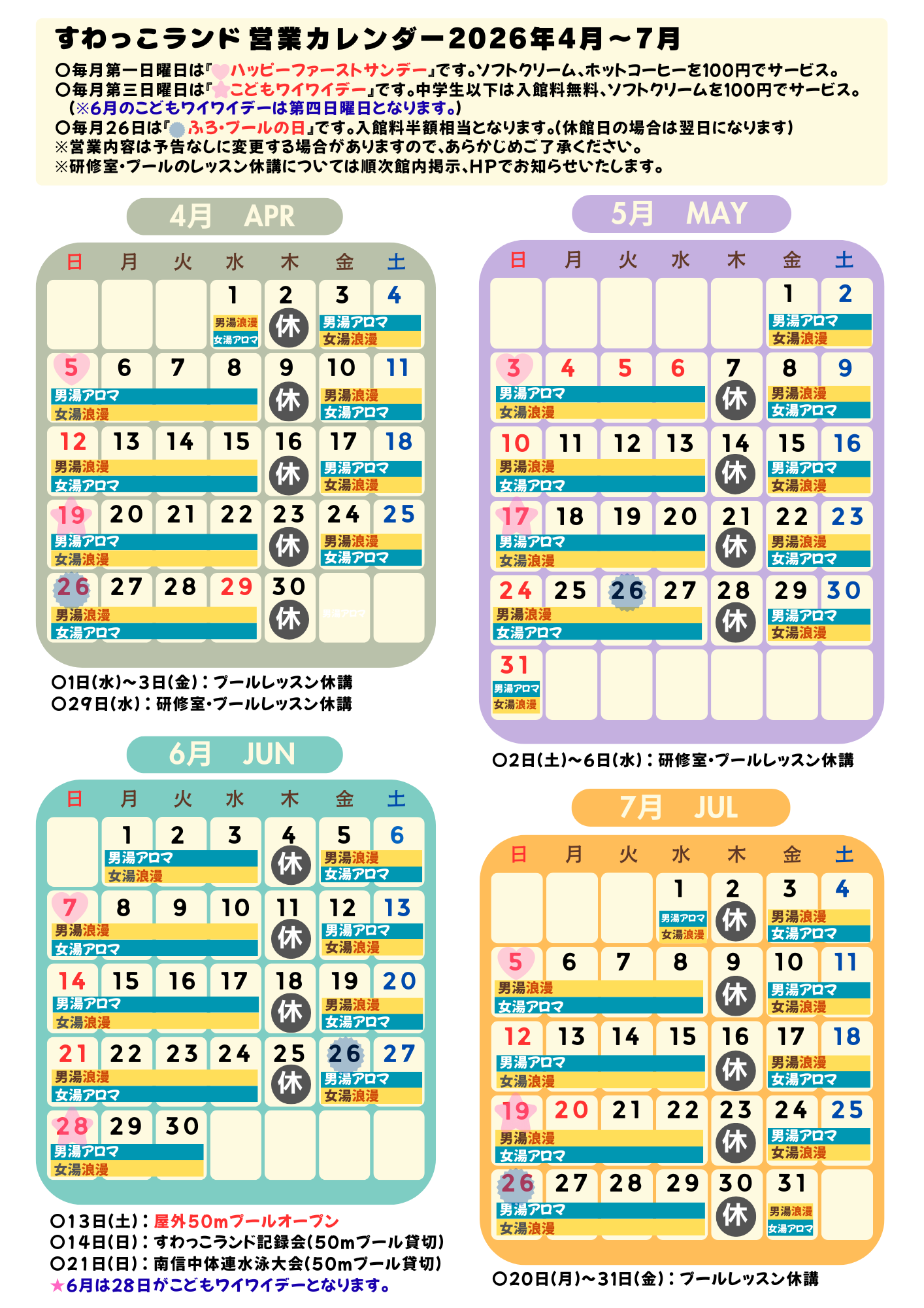 ☆すわっこランド営業カレンダー 2026年4月~7月☆