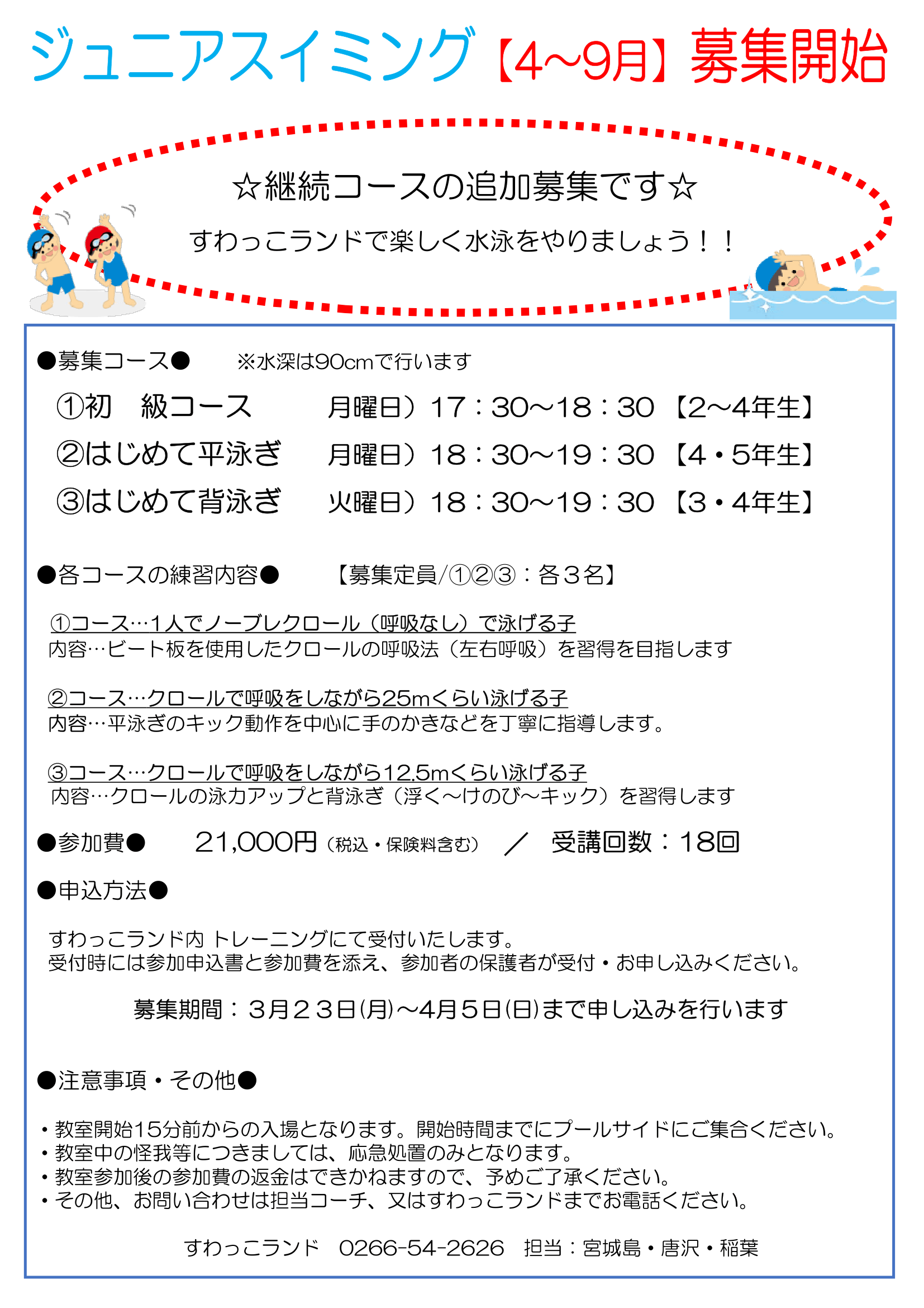 令和8年度ジュニアスイミング受講生【追加】募集 ※各クラス若干名